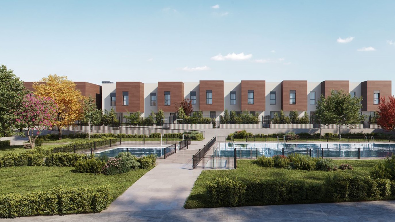 Jardines del Olivar, ubicada en El Restón, se encuentra a escasos 20 minutos de la capital y ofrece viviendas unifamiliares diseñadas en dos plantas para dejar paso a la fluidez de los espacios. El proyecto ha sido concebido para dar respuesta a la actual tendencia del mercado de creciente demanda de viviendas unifamiliares, eficientes, sostenibles y con amplias parcelas de uso privativo combinadas con espacios libres comunes ajardinados y con equipamiento lúdicos. La elección de configuración de la planta baja permite a los compradores la integración de estancias, generando espacios abiertos para la convivencia de la familia.