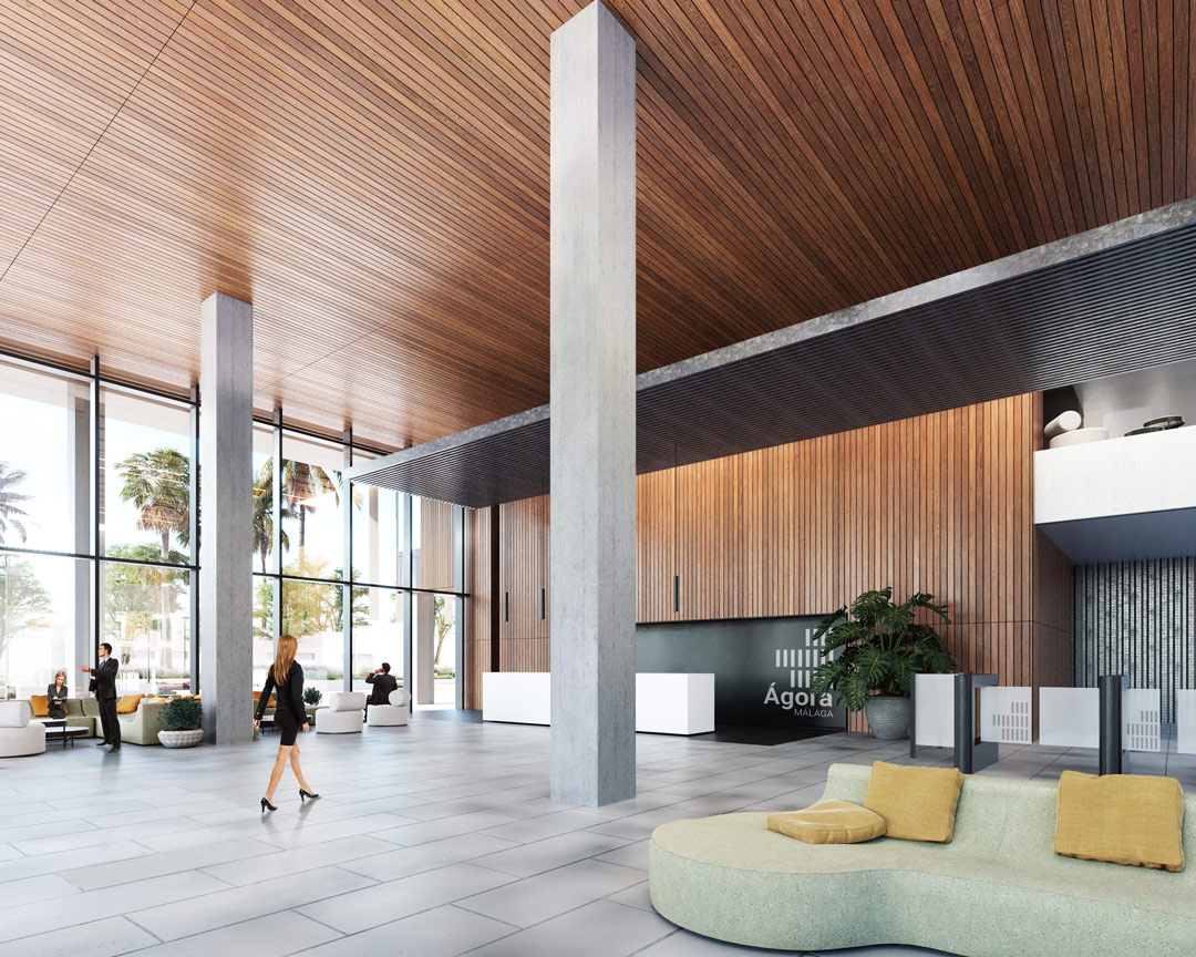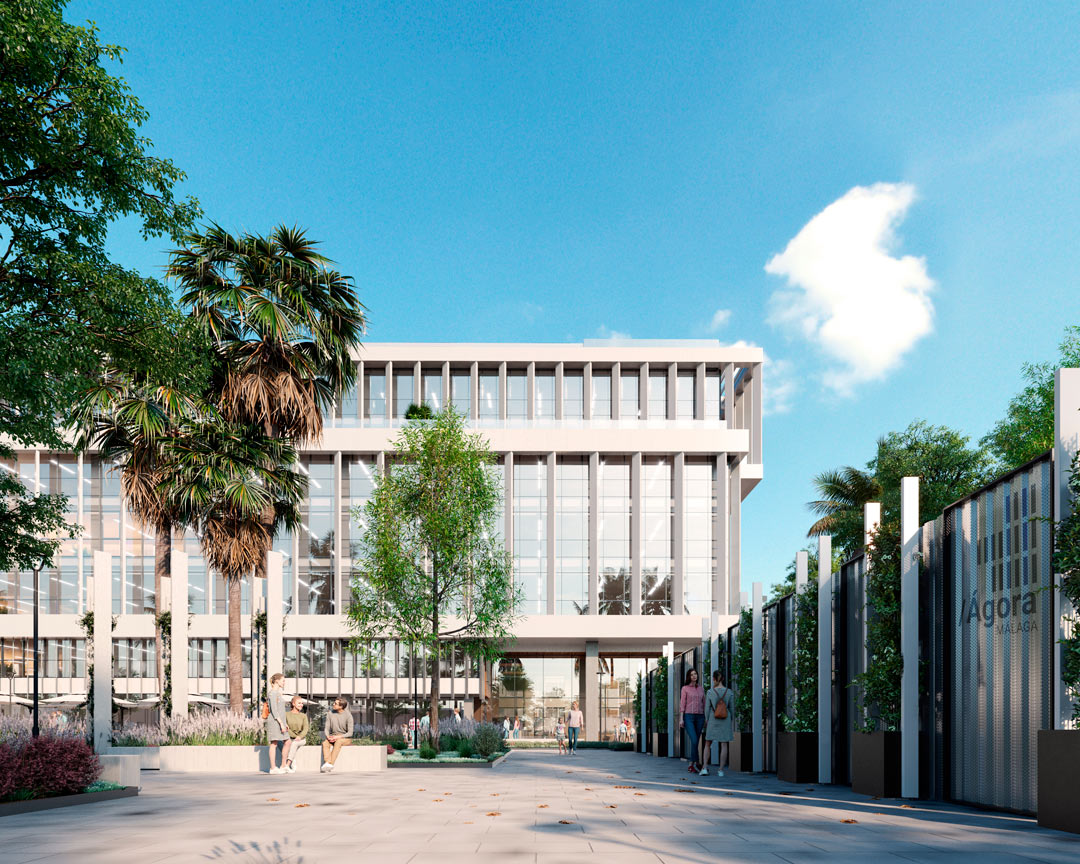 Ágora, un nuevo edificio inteligente de oficinas ubicado junto a Tabacalera, en pleno Paseo Marítimo de Poniente de Málaga. Destacará su innovador diseño vanguardista de fachada bioclimática en el que se levantarán 6 plantas completas de oficinas. La planta baja del edificio se destinará a una plaza de uso público, con amplios jardines, abierta al paseo marítimo.