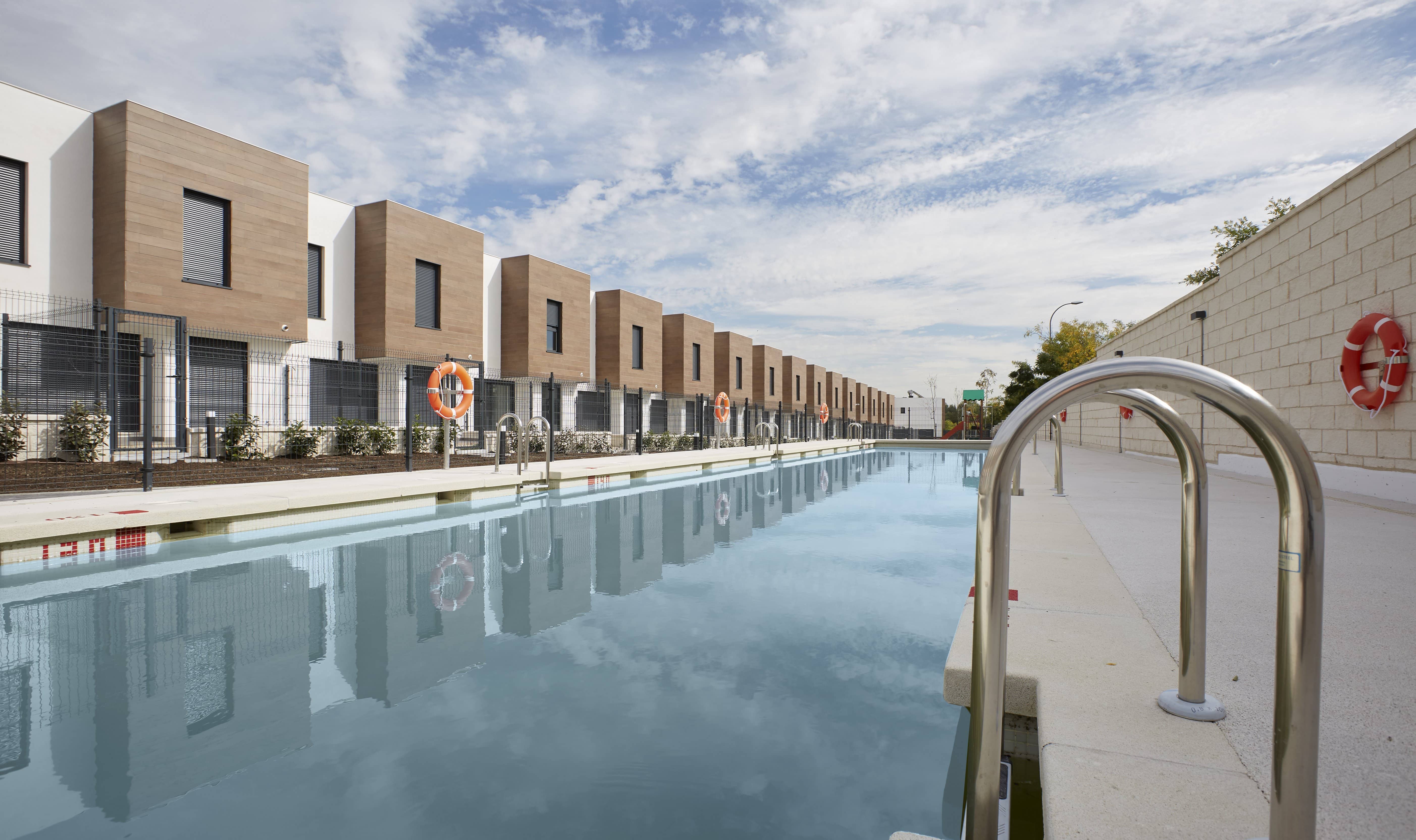 Zonas comunes ajardinadas de más de 1.825 m² con piscina de adultos de 25 m. de longitud, piscina infantil y zona de juegos para los más pequeños.