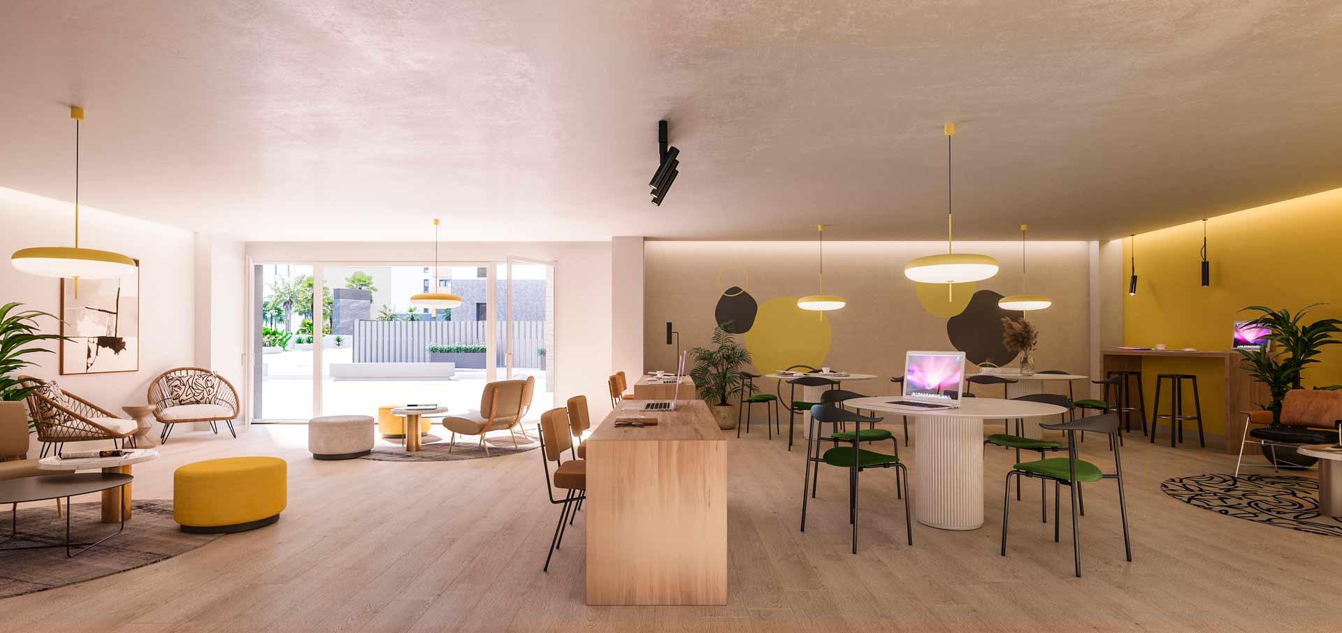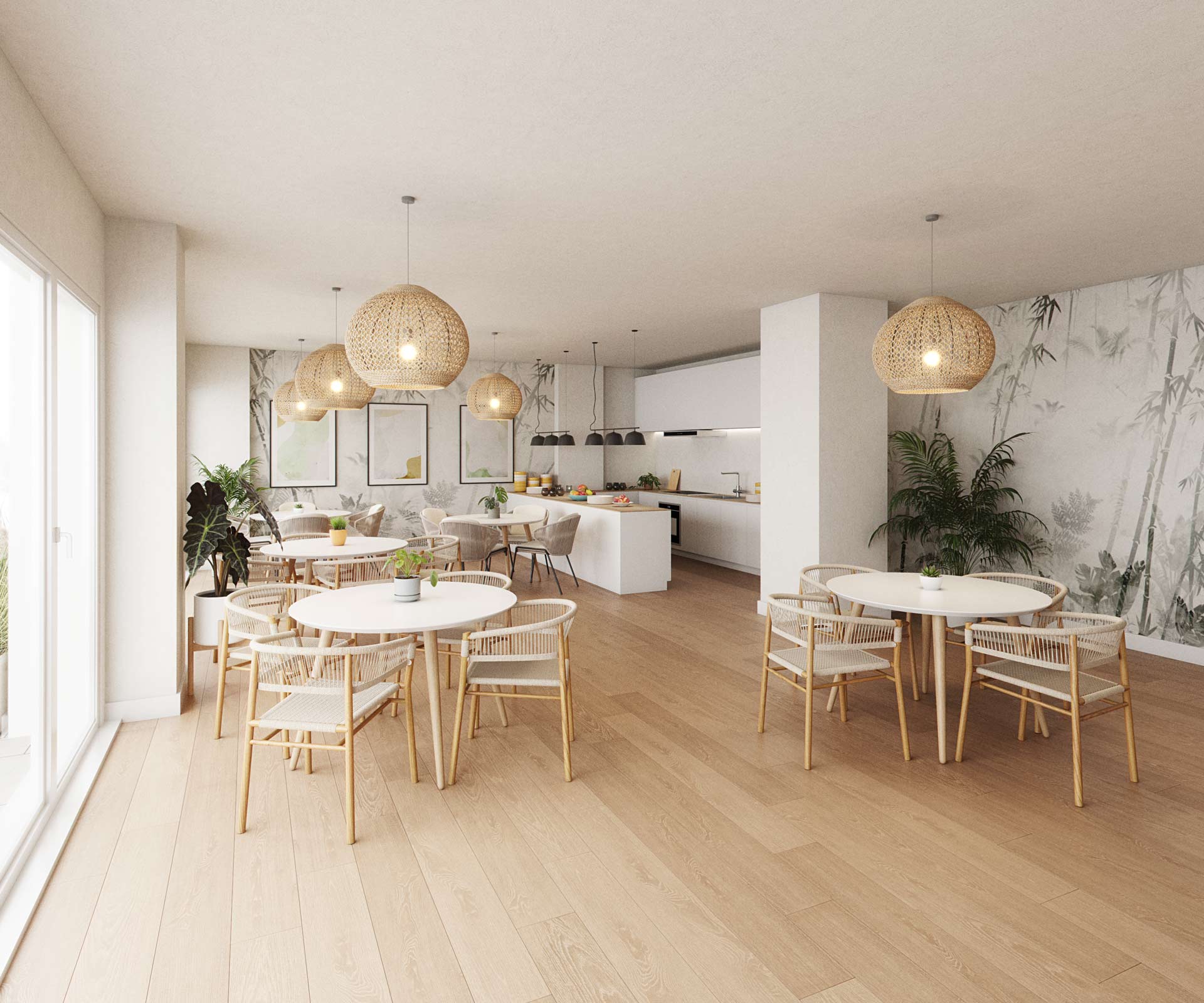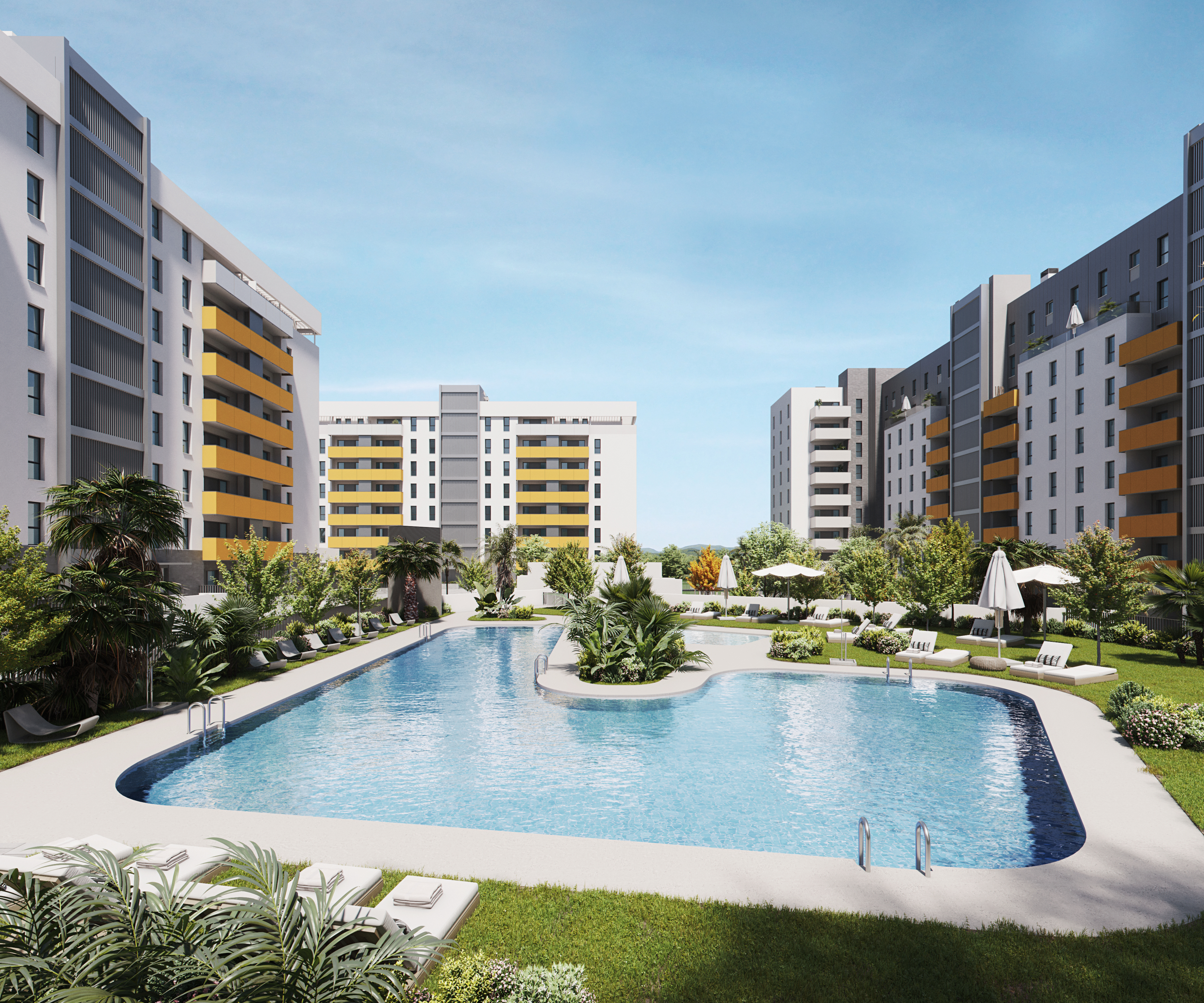 El complejo contará con amplias zonas comunes con piscina de adultos, piscina infantil, parque de juegos, pista de pádel, gimnasio, salón social, sala coworking y zonas verdes, donde encontrar un amplio abanico de posibilidades de ocio.