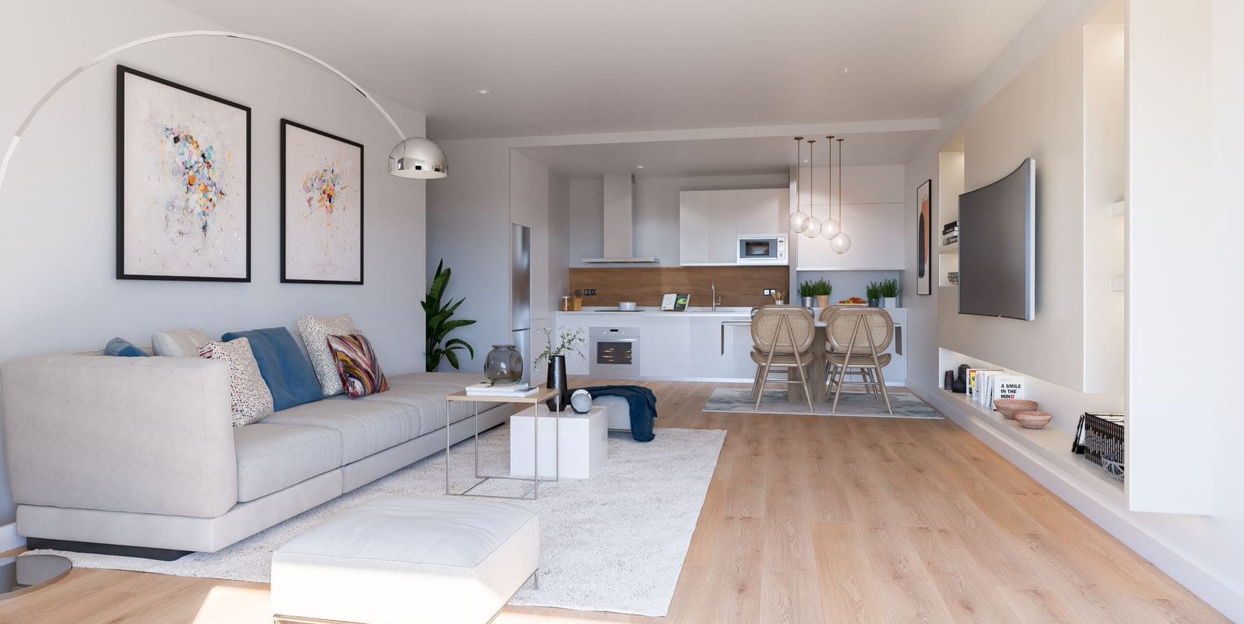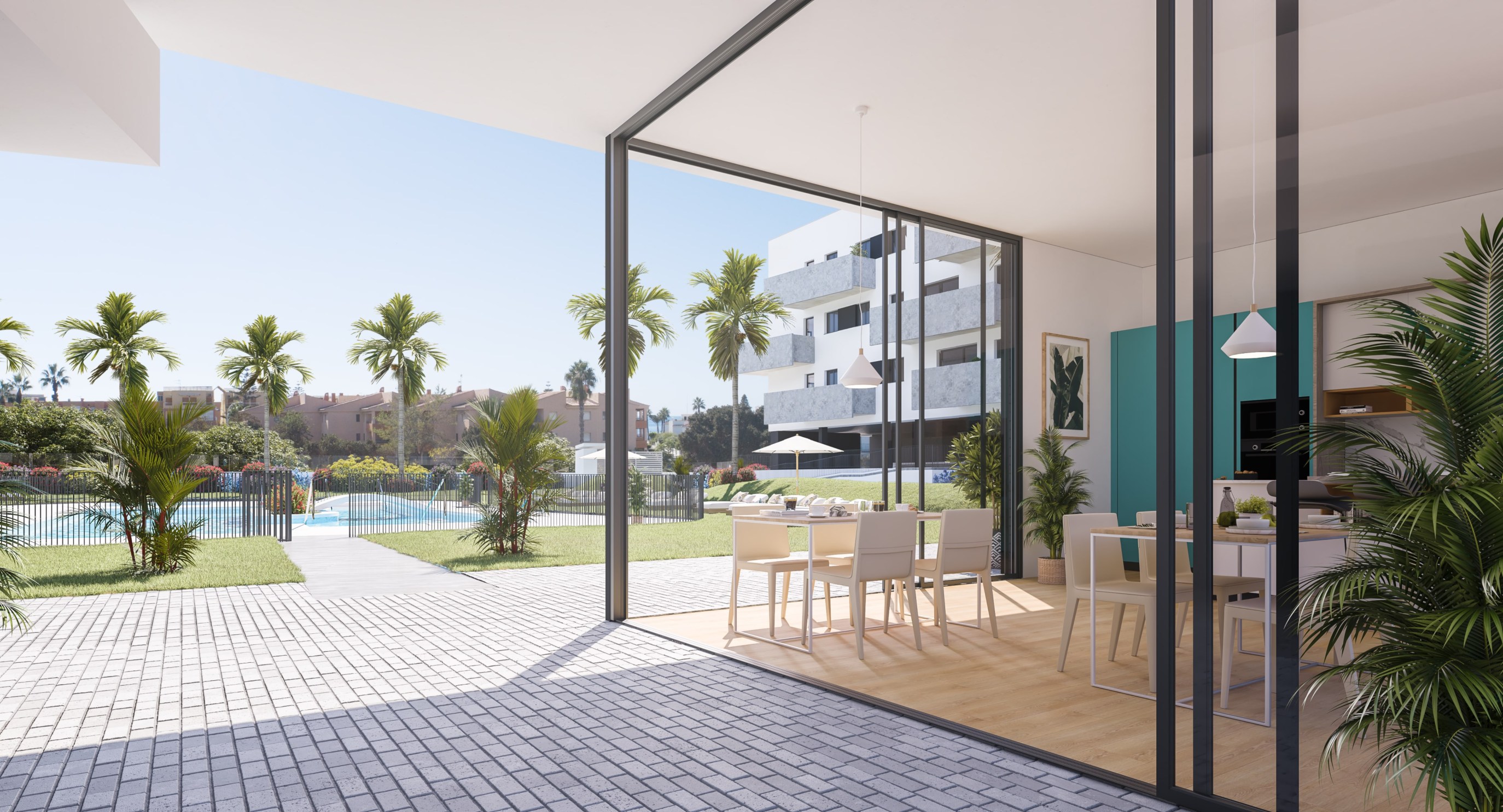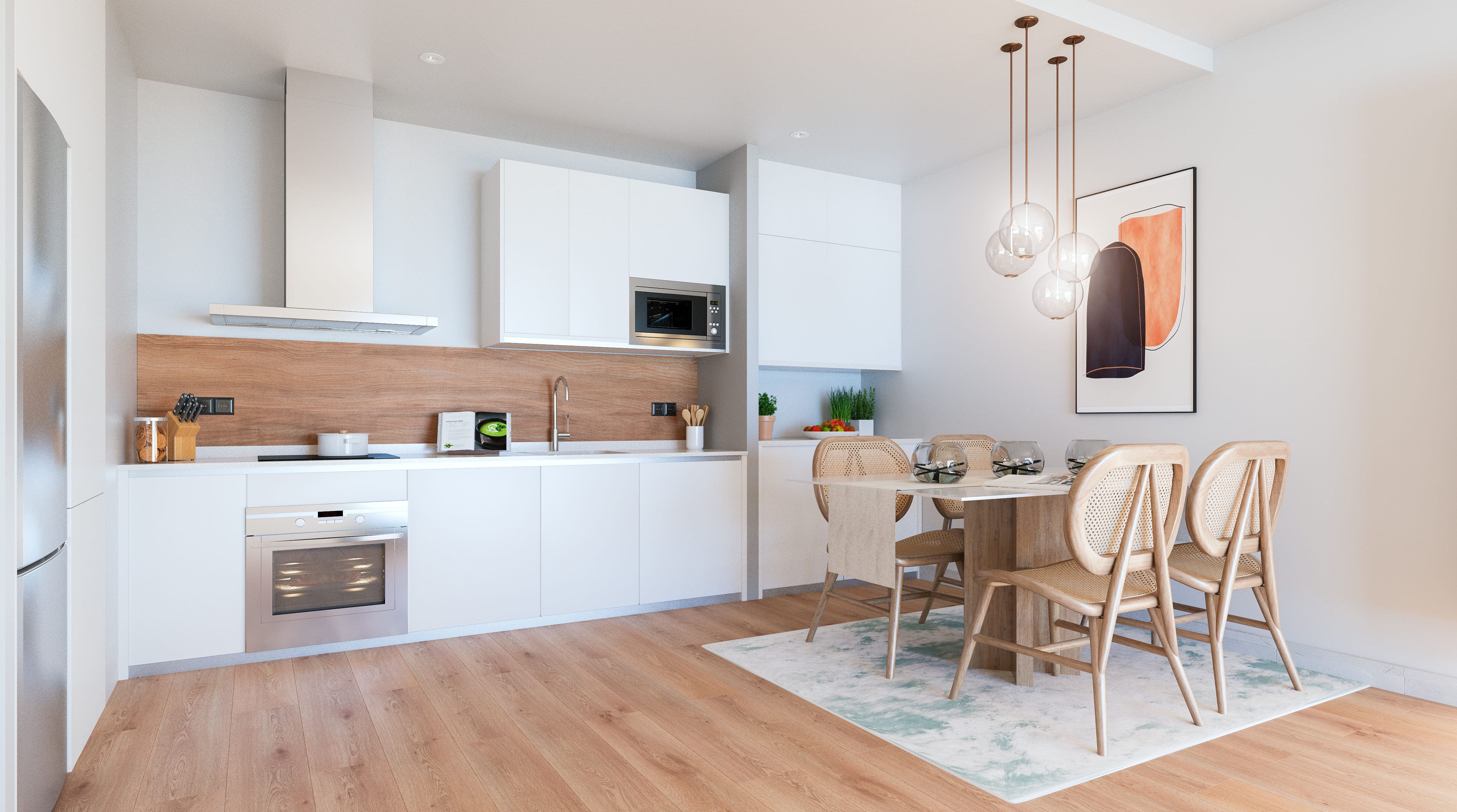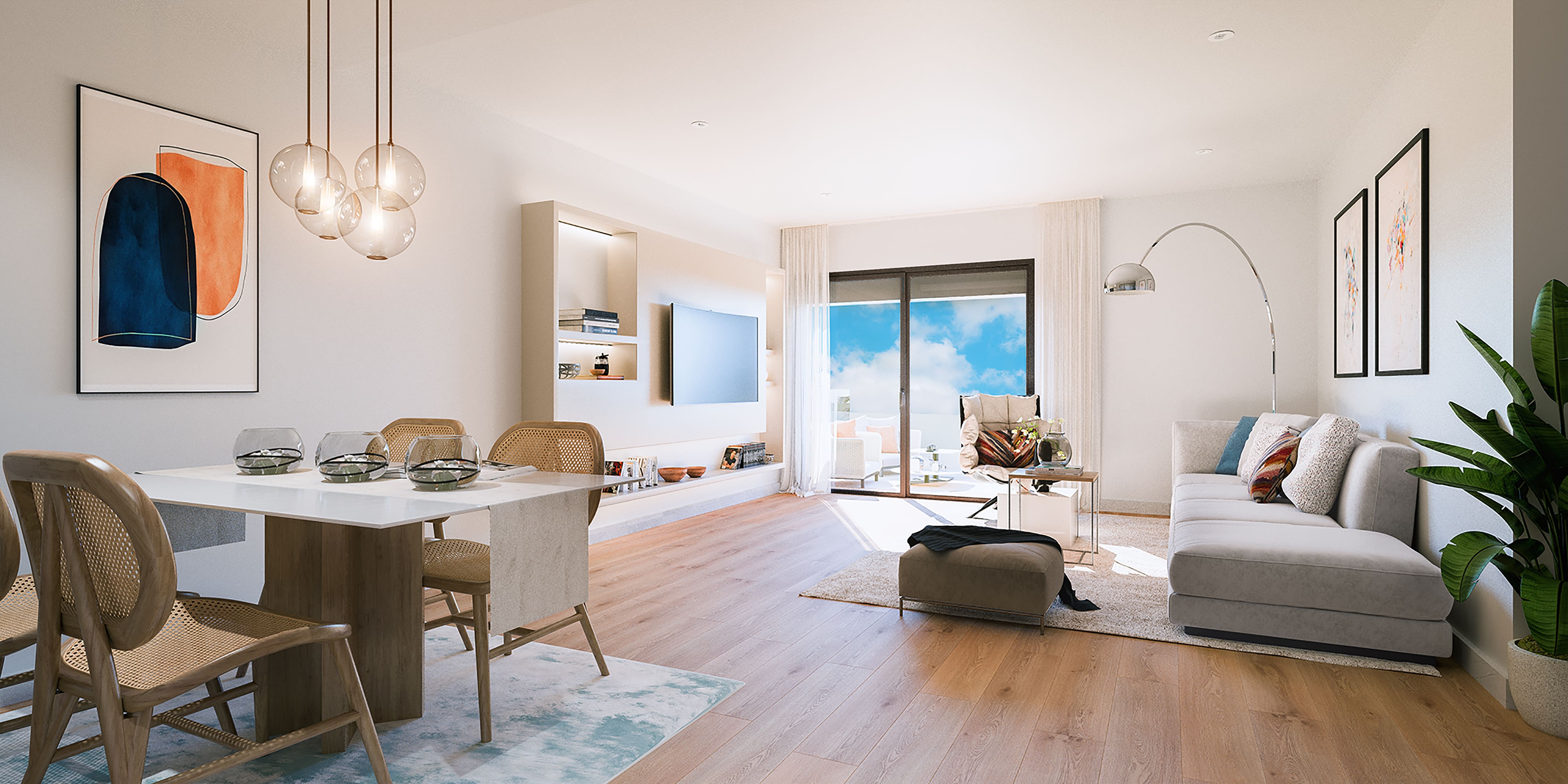 Viviendas de 2 y 3 dormitorios con terrazas, 2 baños y con excelentes calidades de construcción que incluye la pre-instalación de aire acondicionado y cocina amueblada con electrodomésticos (campana extractora, placa vitrocerámica, horno y microondas). Además, las viviendas cuentan con garaje y trastero incluidos en el precio.